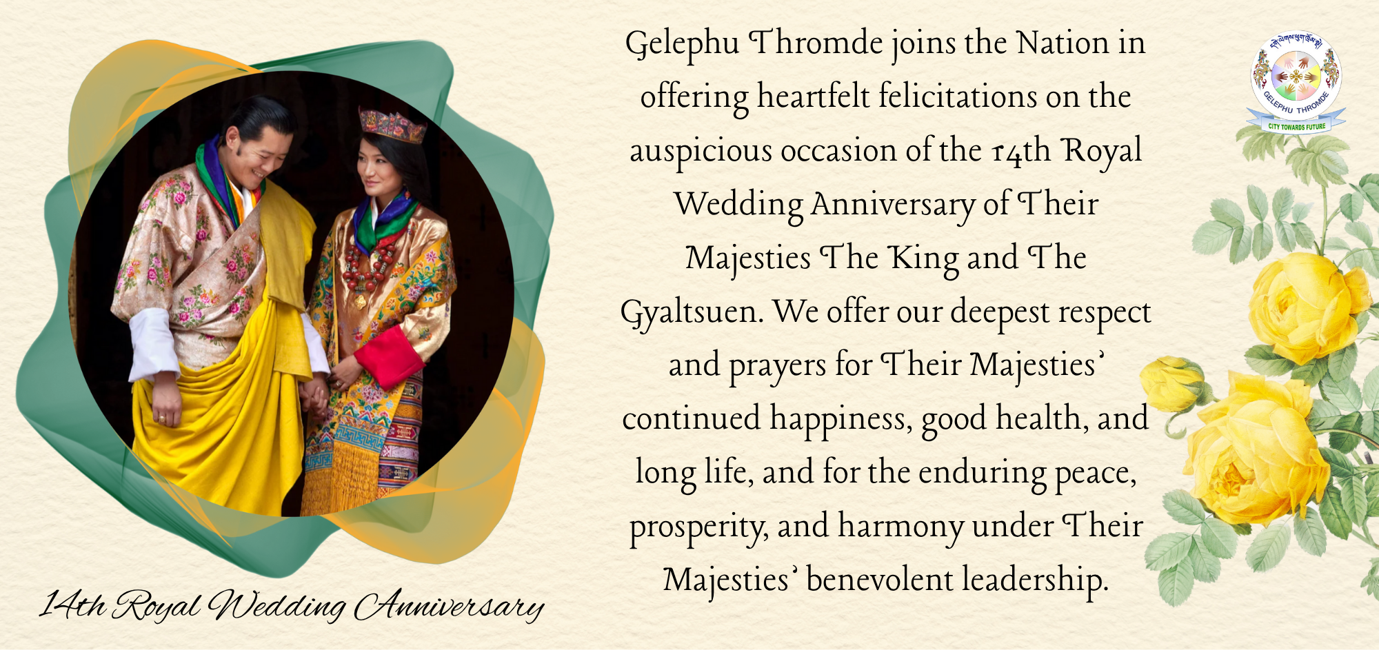 Gelephu Thromde joins the Nation in offering heartfelt felicitations on the auspicious occasion of the 14th Royal Wedding Anniversary of Their Majesties The King and The Gyaltsuen. We offer our deepest respect and prayers for Their Majesties’ continued happiness, good health, and long life, and for the enduring peace, prosperity, and harmony under Their Majesties’ benevolent leadership.
