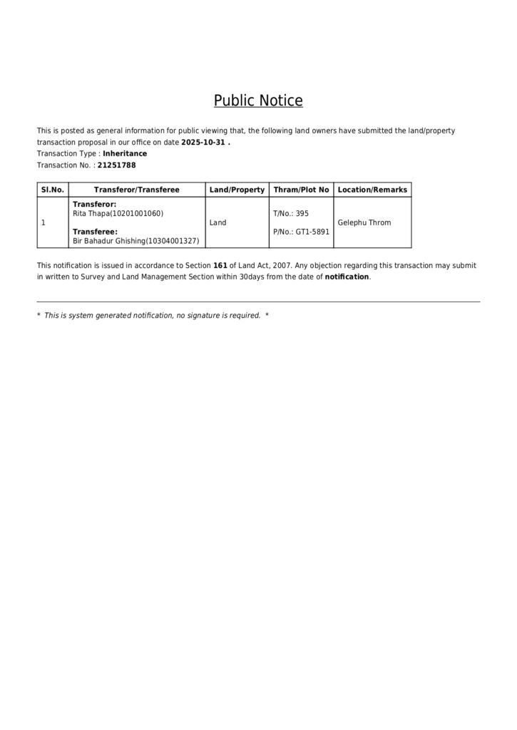 This is to inform the general public that the following land/property owners have submitted a land/property transaction proposal to our office on 31st October 2024.
